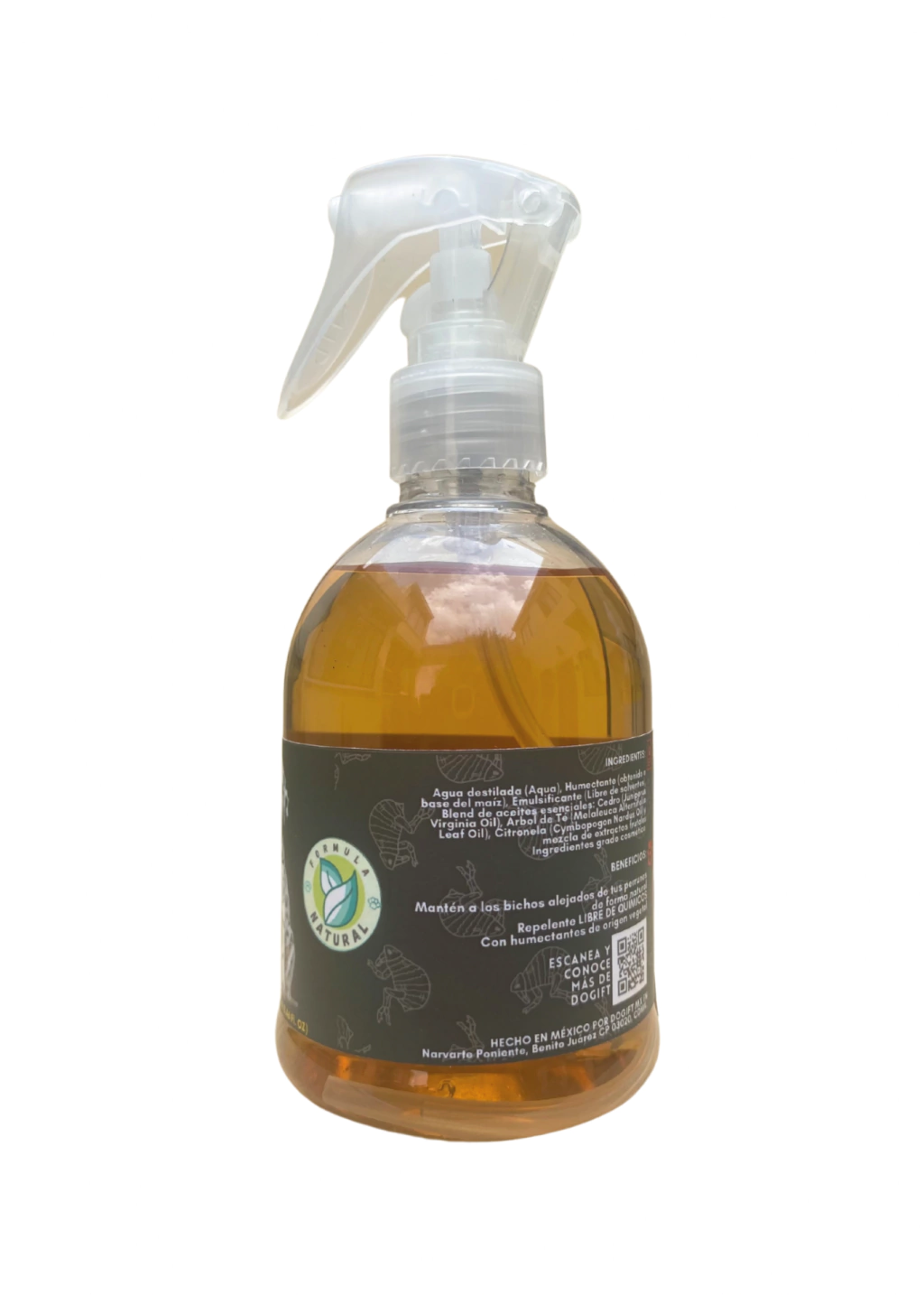 Agua destilada (Aqua), Humectante (obtenido a base del maíz), Emulsificante (Libre de solventes), Blend de aceites esenciales: Cedro (Juniperus Virginia Oil), Árbol de Té (Melaleuca Alternifolia Leaf Oil), Citronela (Cymbopogon Nardus Oil) y mezcla de extractos frutales